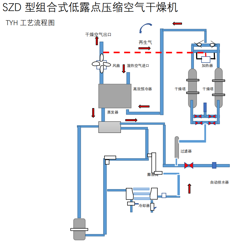 组合式干燥机有机地将冷冻式干燥机与微热再生干燥机集成组合在一起,采用了专利新工艺新流程,是低能耗节能型产品,能满足用户对气体露点的高品质要求,产品具有冷干机和微热吸干机的所有优点。
