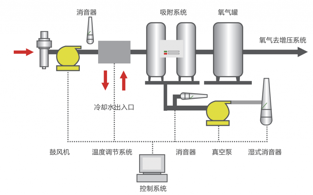 吸附:预处理后的空气进入装有沸石的容器中,以去除水分和二氧化碳,并在氧气通过容器出口时吸附氮气。在沸石的吸附能力耗尽之前,吸附过程被中断。